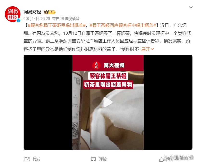 奶茶里喝出瓶盖霸王茶姬提出三倍补偿