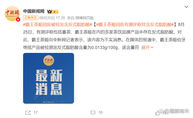深圳市宝安区市场监视办理局工做人员暗示,消费者可通过12315热线进行赞扬。按照《中华人平易近国食物平安法》第一百四十八条,消费者因不合适食物平安尺度的食物遭到损害,可要求补偿丧失,并可从意领取价款十倍或丧失三倍的补偿金,添加补偿的金额不脚一千元的,按一千元计较。对此,有律师指出,商家因操做疏忽导致异物混入饮品,存正在较着。“消费者可从意补偿,并非仅按价款三倍计较。《中华人平易近国食物平安法》最低补偿金额为1000元,《中华人平易近国消费者权益保》则为500元。”8月25日,相关发布文章《送检8大奶茶品牌:喜茶奈雪等5家产物检出反式脂肪酸 糖钠含量遍及偏高》。文中称,奈雪、蜜雪冰城、茉莉奶白、爷爷不沏茶、沪上阿姨、茶百道8个支流茶饮品牌的“王牌奶茶”送检专业机构。检测成果显示,上述品牌的产物中糖和钠含量偏高,持久饮用会对身体健康形成晦气影响。此中,喜茶的烤黑糖波波牛乳茶、奈雪的金色山脉珍珠奶茶、茉莉奶白的栀子奶白、霸王茶姬的伯牙绝弦、爷爷不沏茶的空山栀子,这5款奶茶被检出反式脂肪酸。对此,霸王茶姬称,该内容为不实动静。其称,“按照国度食物平安风险评估专家委员会发布的《中国居平易近反式脂肪酸炊事摄入程度及其风险评估》演讲,食物中反式脂肪酸来历分为天然来历和加工来历,乳及乳成品中天然来历的反式脂肪酸平均含量为0。83g/100g”,霸王茶姬方面暗示,“这也导致了利用实奶的茶饮产物正在检测中呈现微量反式脂肪酸的现象。”