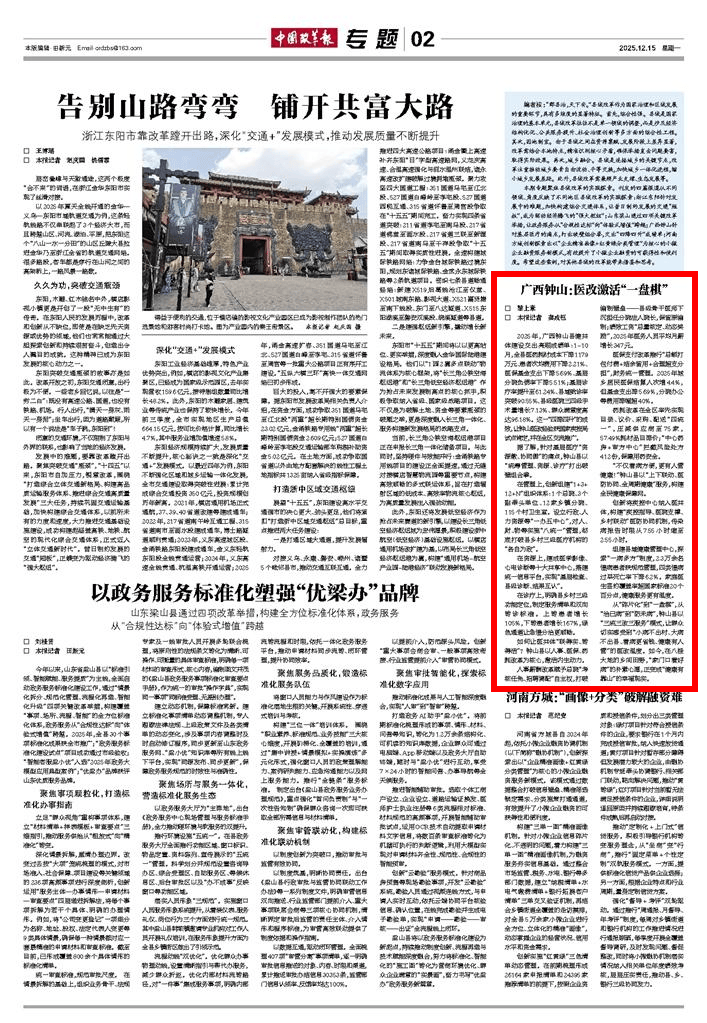 12月15日,国度成长和委员会从管的《中国报》“第02版·专题”,以《广西钟山:医改激活“一盘棋”》为题,对广西钟山县立异“三统三改三办事”模式扶植健共体的成功做法进行刊道。